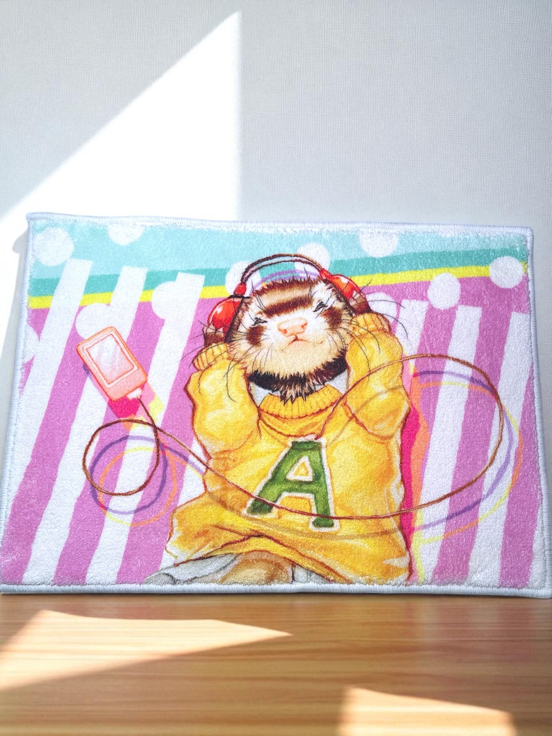 可愛いフェレットが音楽を楽しむデザインで、あなたのお部屋をおしゃれに演出してくれます。表面は滑らかで、心地よい触感を提供します。