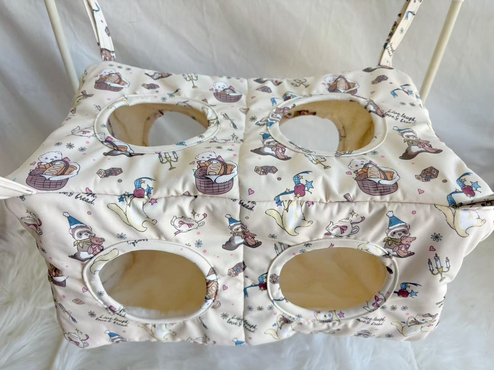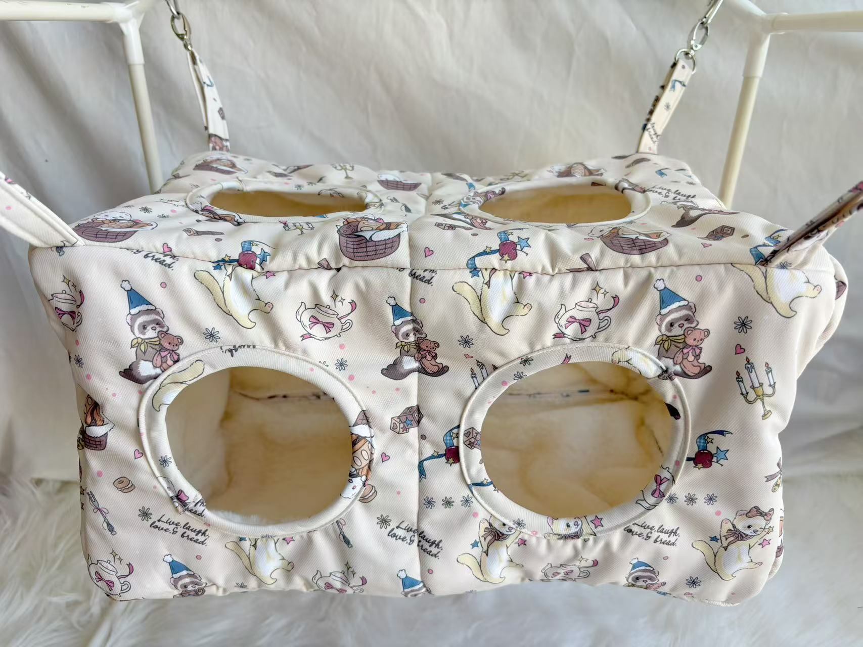 ハンモック内部は通り抜け可能な穴の空いた仕切りを設置し、フェレットにとって安心のできる居心地のいい休憩スペースとなっております!